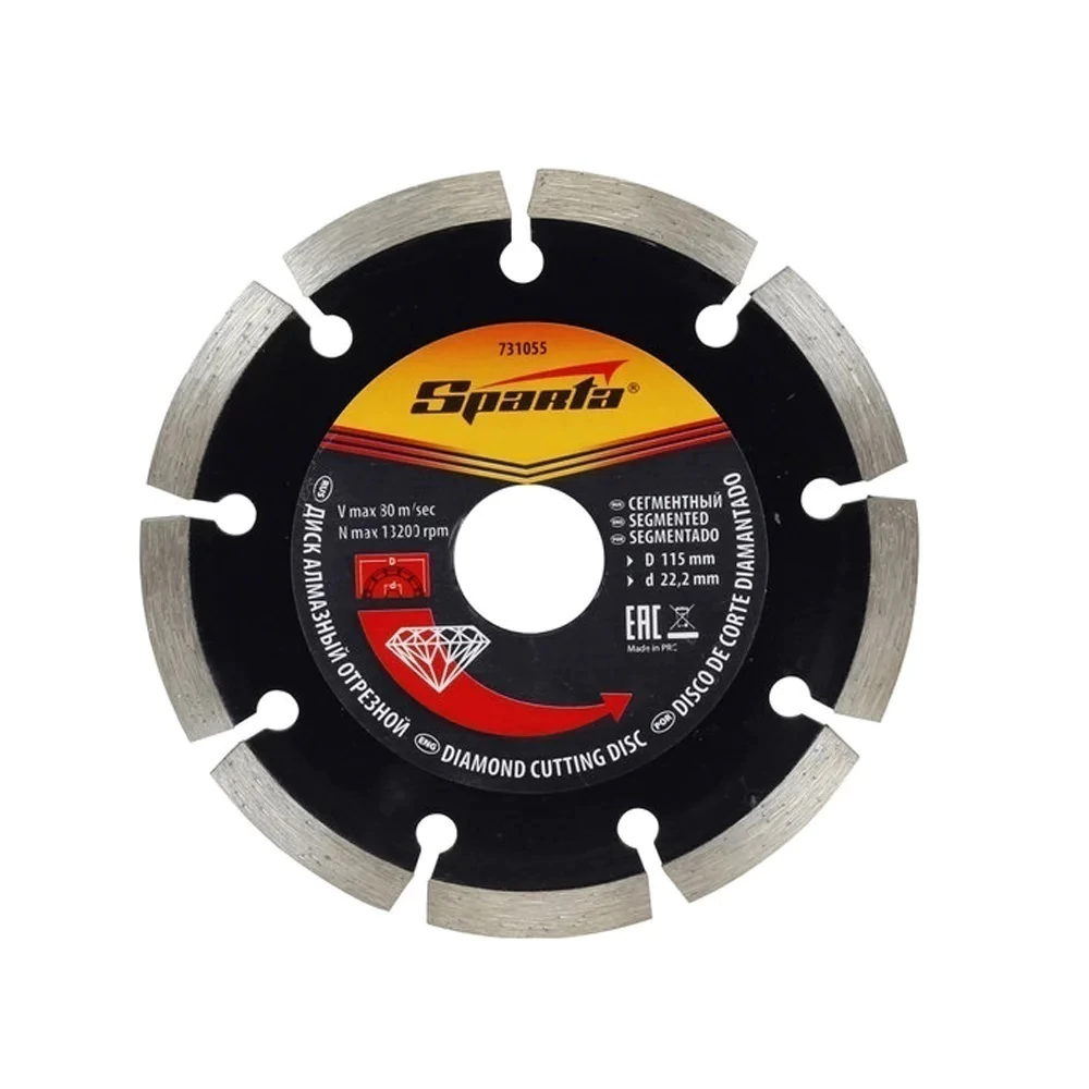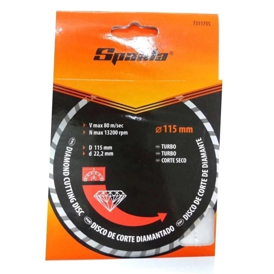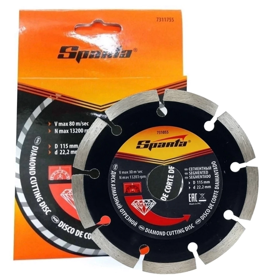 Disco de Corte Seco Diamantado Segmentado 115x22,2mm Sparta 4,5 Polegadas Disco de Corte Seco Diamantado Segmentado 115x22,2mm Sparta O disco segmentado SPARTA fornece uma camada de protecção do lado do desgaste de corte. As unidades de corte caracterizadas por alta concentração de diamante, melhoram a qualidade de corte por possuirem grãos de diamante e liga metálica combinada de maneira adequada. Estas vantagens proporcionam melhor desempenho e vida útil.
